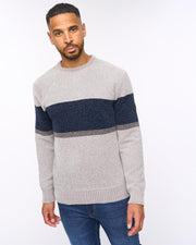 - Colour-blocked knit with navy and grey stripes classic crew neckline with ribbed collar cuffs