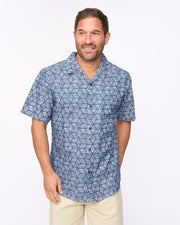 The Caladium Shirt from Bewley & Ritch is a mens short sleeve Cuban collar shirt featuring an all-over geo print design. Crafted from cotton fabric with branded poly buttons and a French front placket.